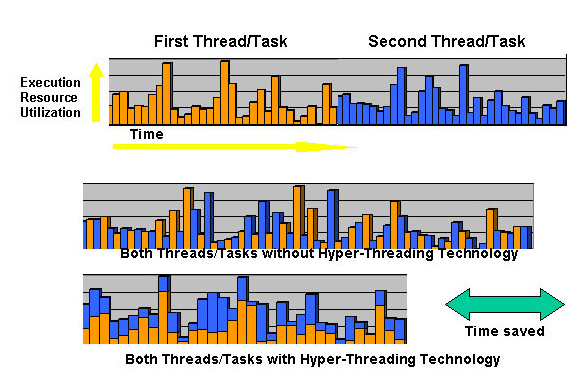 *세번째 그래프는 하이퍼 스레딩을 적용했을 때의 구동 원리를 나타낸 것인데, 일반적으로 멀티 태스킹을 위해 쪼개진 사이클마다 번갈아가며 작업이 이루어지는 것과는 달리, 매 사이클마다 자원의 여유 공간에 또 다른 작업을 수행시켜, 두 작업이 필요로 하는 자원의 양이 100%에 못 미칠 경우에는 두 사이클이 걸릴 과정을 한 사이클 내에 끝내도록 하고 있습니다. 물론 합이 100%를 넘는 경우에는 한 사이클에서 처리가 완료되지 않고 부족한 자원만큼은 다음 사이클로 넘어가게 됩니다. 따라서 듀얼프로세서, 혹은 하이퍼스레딩을 이용하더라도 성능이 정확히 2배가 되는 일은 없습니다. 다만 약간의 성능향상은 기대 할 수 있습니다.